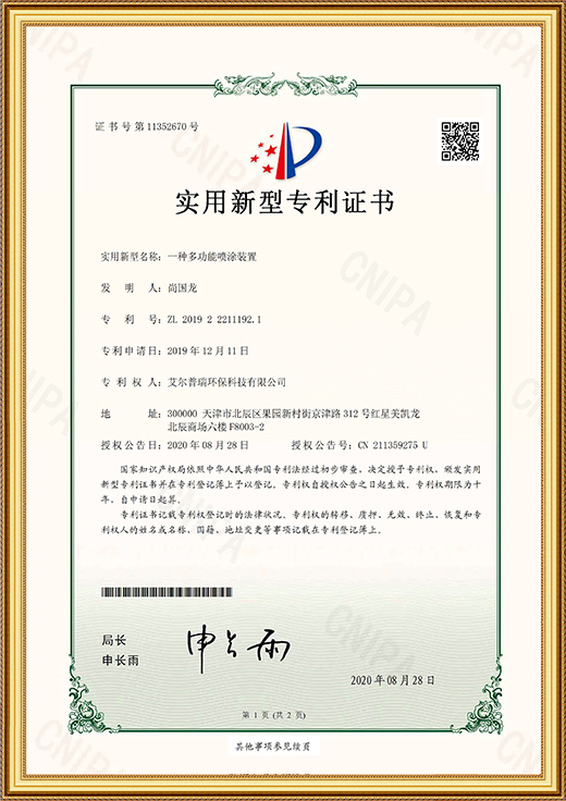 • 實用新型專利證書(一種多功能噴涂裝置)